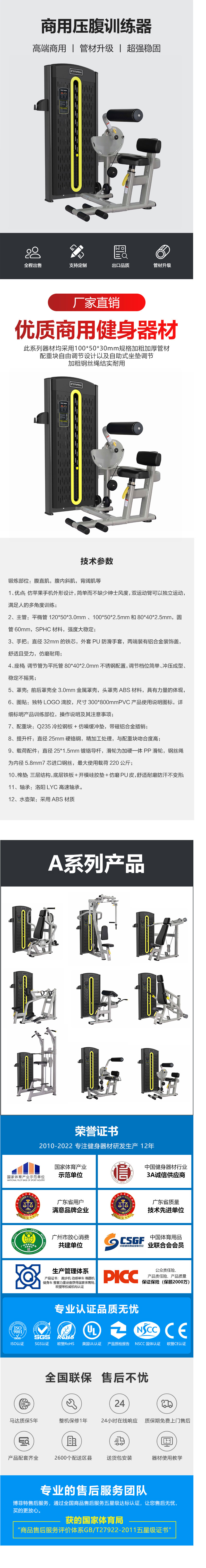 9、載荷配件:直徑25*1.5mm鍍鉻導杆,滑輪為加硬一體PP滑輪,鋼絲繩為內徑5.8mm7芯進口鋼絲,最大使用載荷220公斤;