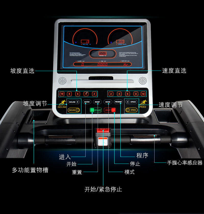 坡度直選功能、軟停止及總裏程記錄功能、心率控製速度功能 |